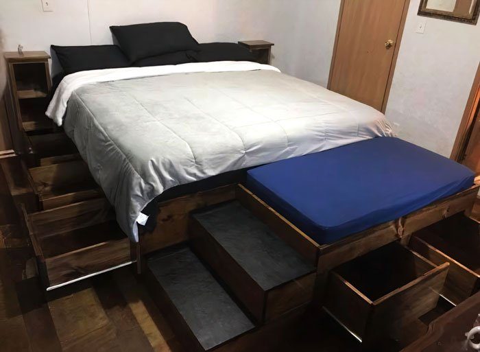 Кровать для любителя домашних животных оснащена шестью выдвижными ящиками для хранения (по 3 с каждой стороны), что экономит кучу места, которое в противном случае было бы потрачено впустую. Ящики аккуратно помещаются в нижней части каркаса кровати. Каркас кровати сделан из сосны и по желанию заказчика может быть покрашен в различные оттенки — золотистый дуб, темный орех, классический серый и прочие.