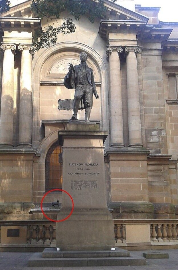 У здания сиднейской библиотеки стоит статуя Мэтью Флиндерса, знаменитого английского мореплавателя и картографа, который помог составить карту Австралии, объявил её континентом и повлиял на то, чтобы она получила своё нынешнее название. На оконном карнизе позади статуи скромно примостилась небольшая бронзовая фигурка верного кота Флиндерса, Трима, который сопровождал мореплавателя во многих его приключениях.