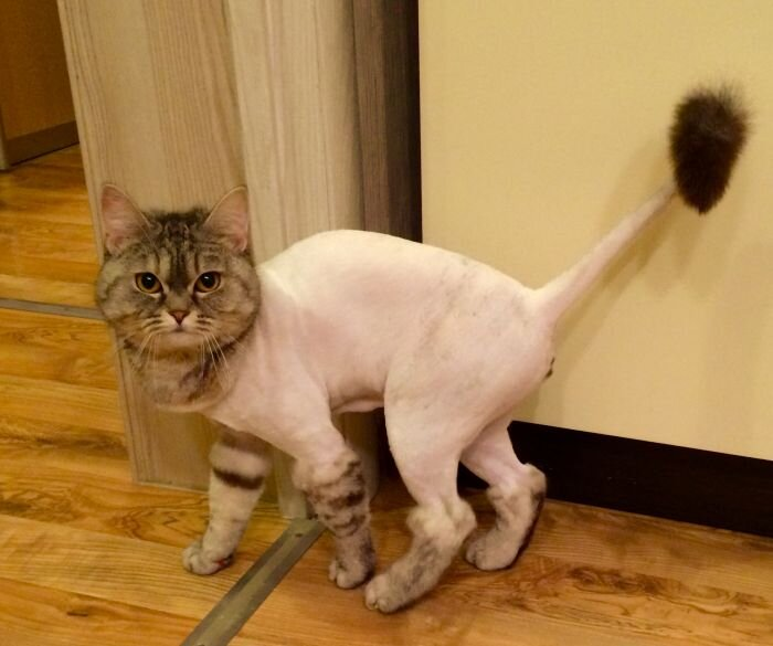Но даже это ещё не всё. Помимо стресса от поездочки животина получает огромный удар по сенсорной системе. У собак и котов по всему телу есть чувствительные волоски-вибриссы. Это те же самые усы, как на морде, только чуть меньше и растут пореже. Однако функции выполняют идентичные: сообщают кошке о положении её тела в пространстве относительно других предметов, о дуновении ветерка, о перепадах атмосферного давления и, говорят, даже о приближающихся землетрясениях. Сбривание шерсти машинкой под 0 лишает зверя целой отдельной системы чувств.