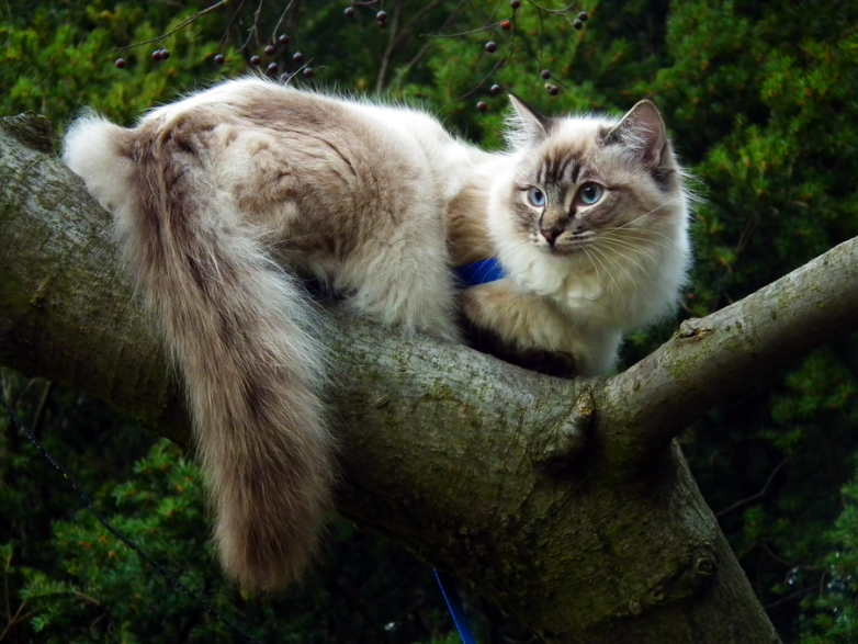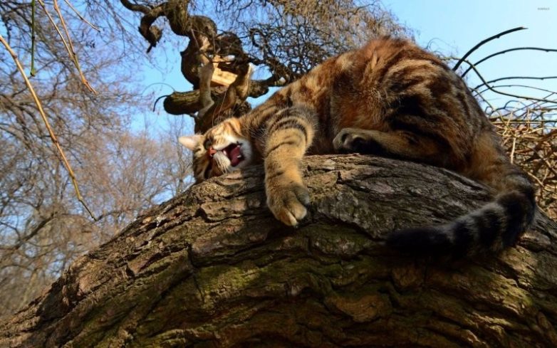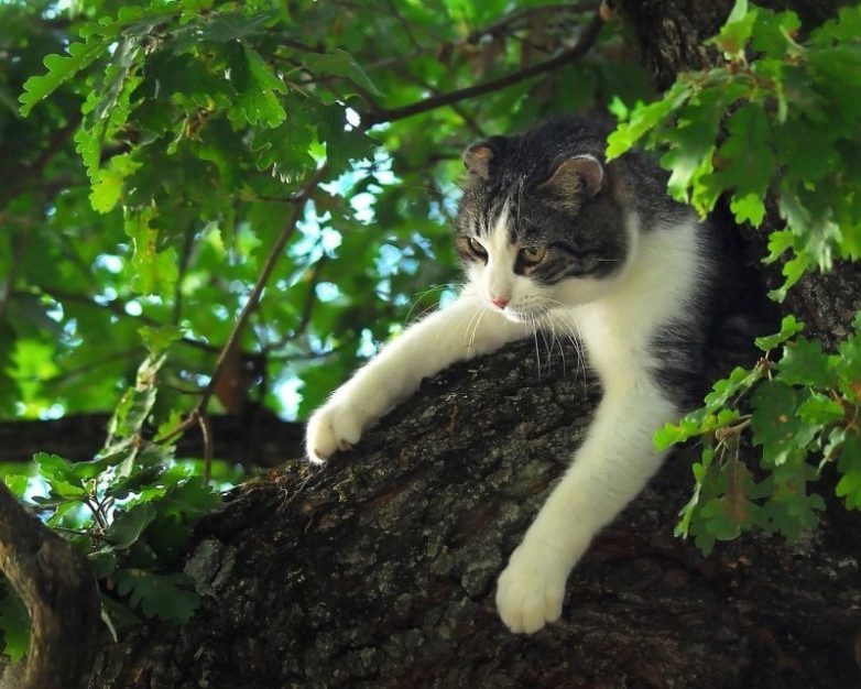 Идеальным местом должно стать то, где не найдут, но при этом и всякие ништяки в виде лежанки и вкусняшек будут в непосредственной близости. Густая крона деревьев в этом плане подходит идеально. Котики – они такие, они знают толк в релаксе.