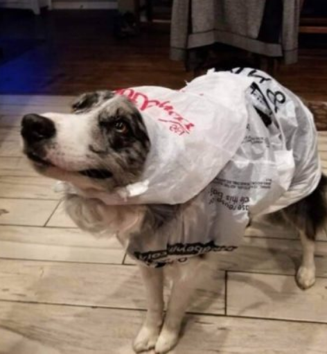 Хозяйка надевает пакеты на свою собаку, чтобы та не вымокла во время прогулки под дождём