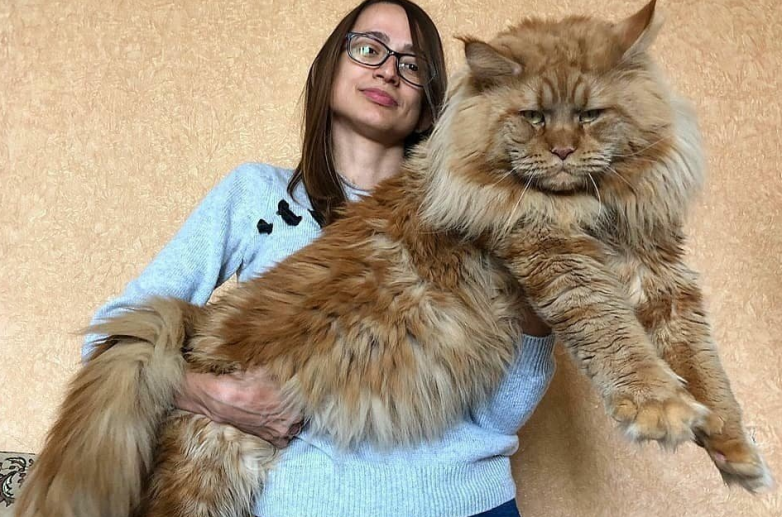 Ого, это что – добрый брат кота Бегемота? Кстати, на этом фото рекордсмен 18 килограммовый мейн-кун из России. Гиганта зовут Кефир, и он живёт у своей хозяйки в Старом Осколе. У него есть свои соцсети. Это местная знаменитость, про которого часто пишут в новостях!