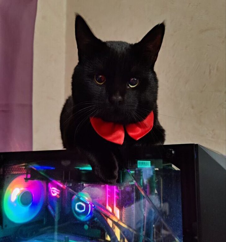 4 апреля, около 2 часов ночи меня выбрали. Мы сидели в машине и болтали, как вдруг снаружи раздалось «мяу». Мы решили посмотреть, кто это. Открыли дверь и в салон подобралось нечто черное, как ночь. Запрыгнуло на колени, свернулось и замурчало. Кот был весь в ранах, а на шее след от тугого ошейника. Был привезен домой, помыт, накормлен и согрет. Сразу определил любимое место — на кровати. Оказался очень нежным и ласковым, любит играть и тыгыдыкать. Лучшая игрушка, конечно же, пакет. Любит «помогать» мне за компом. Так и живем.