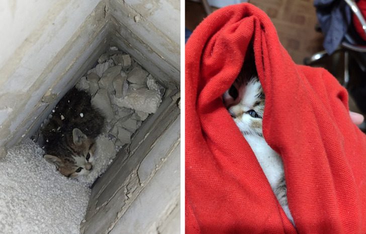 Довелось мне по работе спасать котенка, который каким-то образом попал внутрь пустотной стены здания. Сообщили, что уже несколько дней слышно мяуканье из стены. Приехали, послушали, хм, стена таки мяукает. Выломали кусок и аккуратненько извлекли напуганного котенка. Голодный, замученный, весь в мусоре, месячный котенок отправился со мной домой. Отмыл его, отогрел и назвал Плюх. Мой кот принял его как брата.