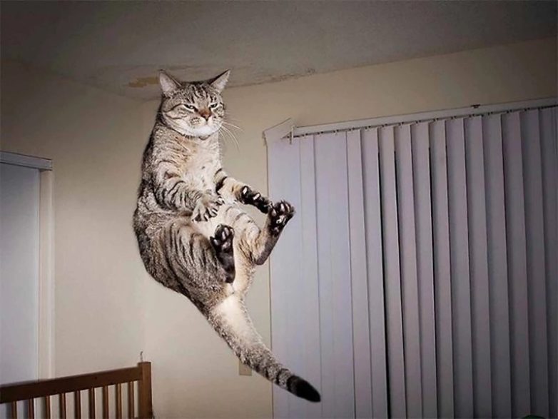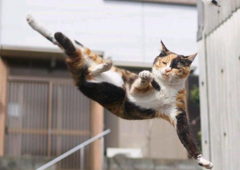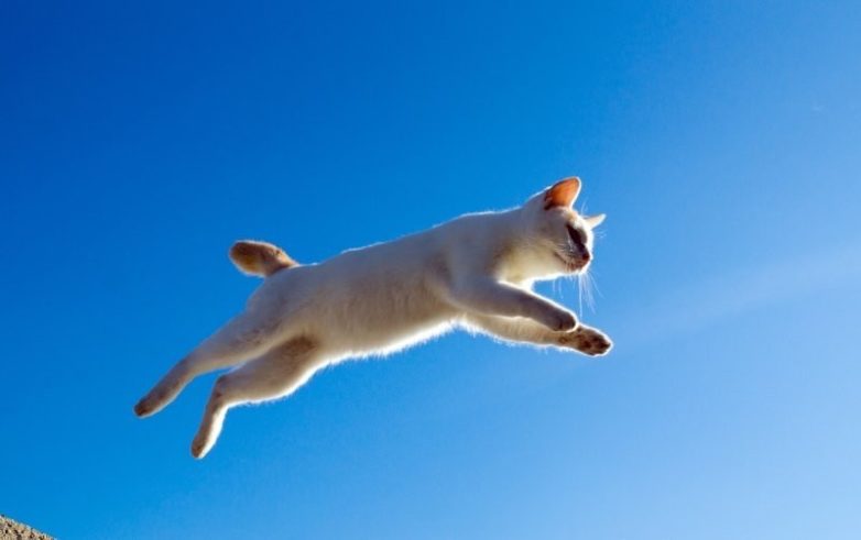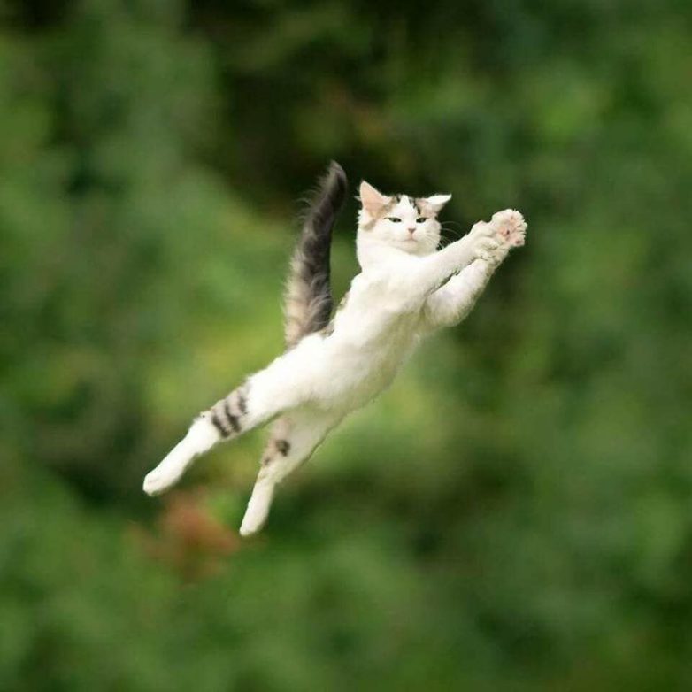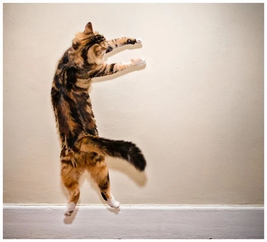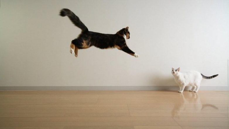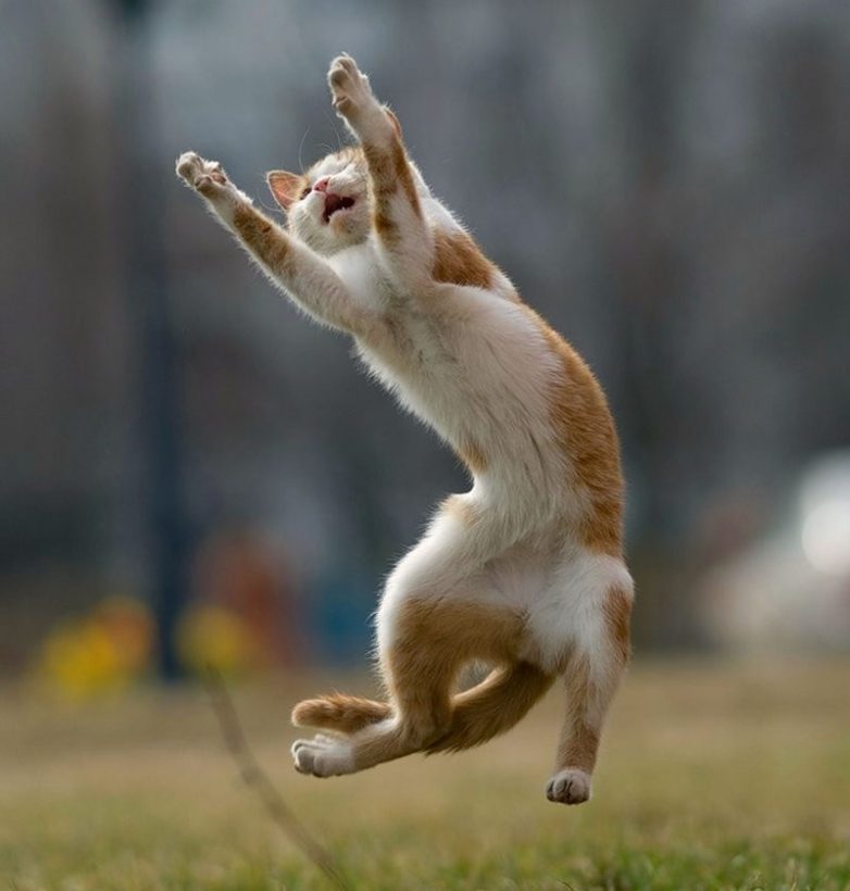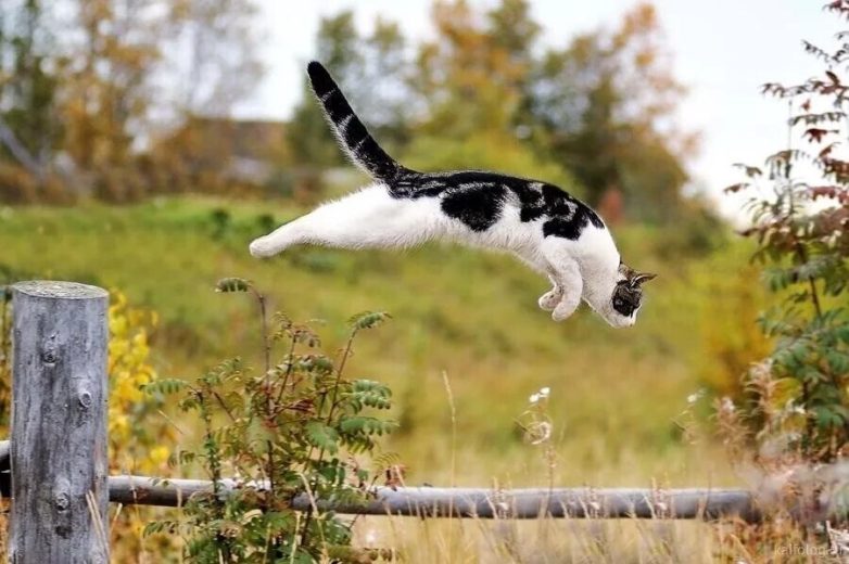 А некоторым счастливчикам повезло. Им не нужно тренироваться. И взвиться в прыжке они готовы в любом состоянии и из любого положения. Вот только что пушистый прыгун мирно посапывал или сытно обедал, как за секунду он вдруг воспаряет в такие дали, что не снились самому опытному и талантливому спортсмену. Котики – они такие. Талант к прыжкам – у них встроенная опция.