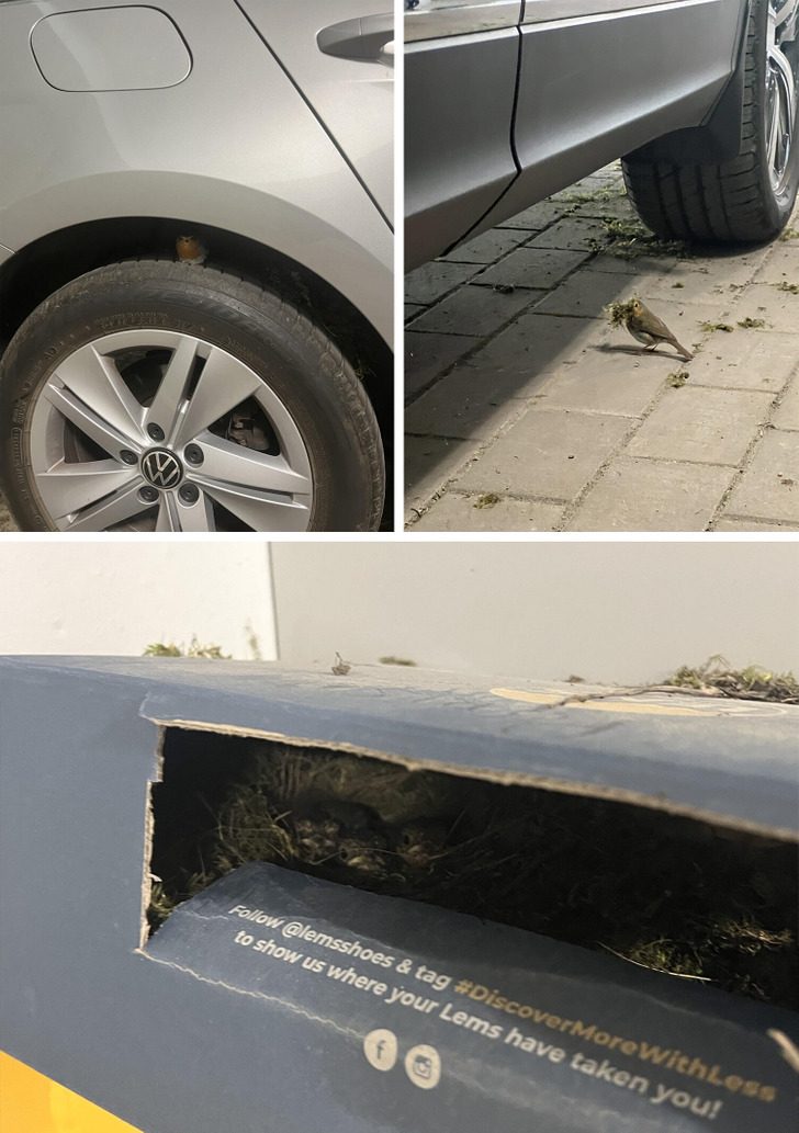 «Пара зарянок решила свить гнездо прямо на колесе нашей машины. Мы переселили их в старую коробку из-под обуви. У них теперь есть три птенца»