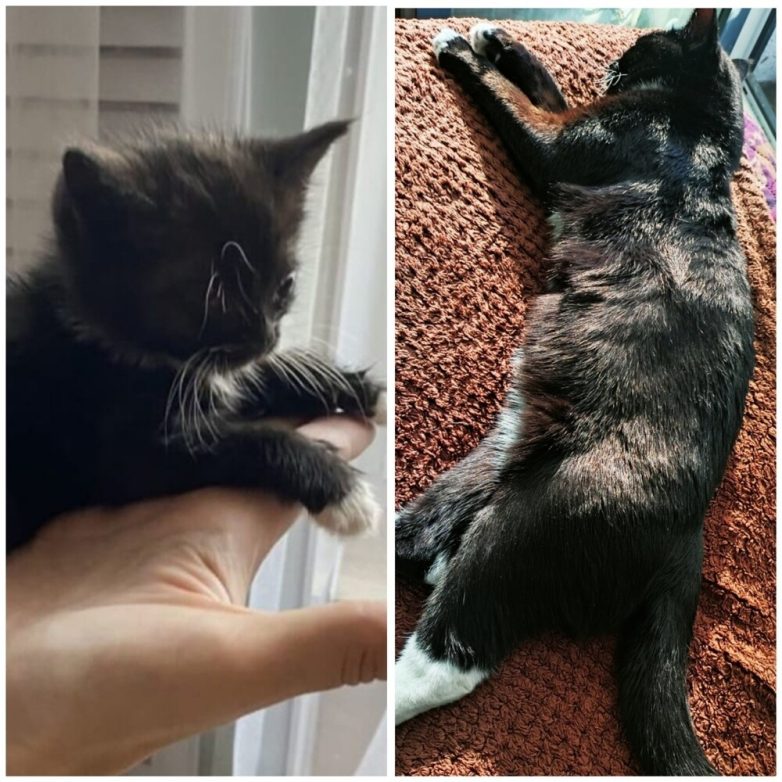 «Касяндра 11 лет назад. Подобрали в подъезде в 30-градусный мороз. Это её первый вечер у нас, где-то месяц ей был. Она же сейчас».