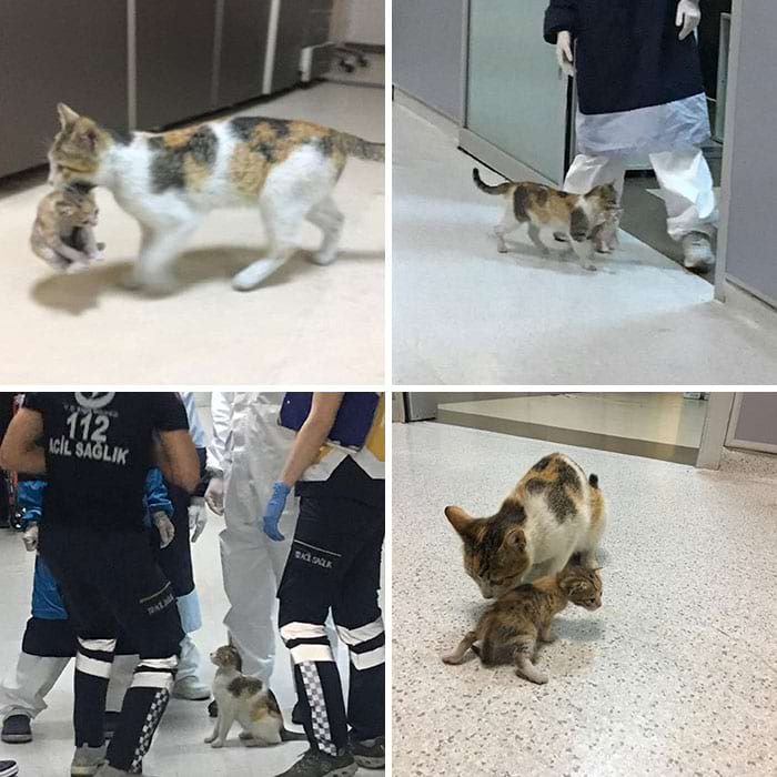 В Стамбуле бездомная кошка-мама отнесла своего детеныша в отделение неотложной помощи. Врачи и фельдшеры оказали помощь котёнку и отвезли его к ветеринару