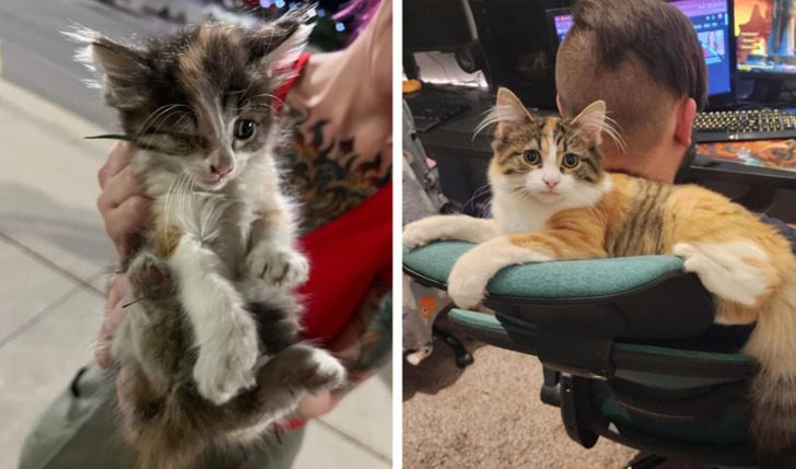 «Нашел эту парочку под машиной. Я не был уверен, что оставлю их себе… Спустя три месяца у них есть автоматическая кормушка и кошачье дерево в каждой комнате. А спят они в моей постели»