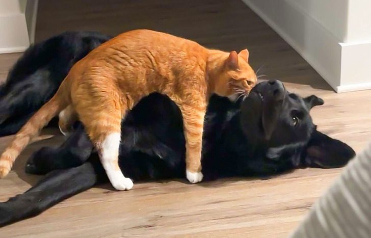 Я завела собаку и старшего кота с разницей в месяц. Так котик пытался накормить собаку мылом — ту тошнило быстрее, чем я могла убирать. Потом кот скормил ей мой ужин. На моменте подачи собаке моющего средства для посуды я уже успела вовремя. Пришлось проводить воспитательную беседу с котом. Ничего, уже 9 лет вместе.«Лучшие друзья»