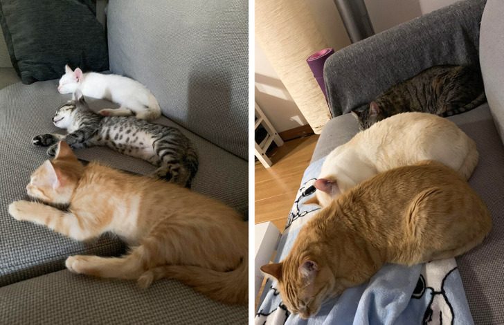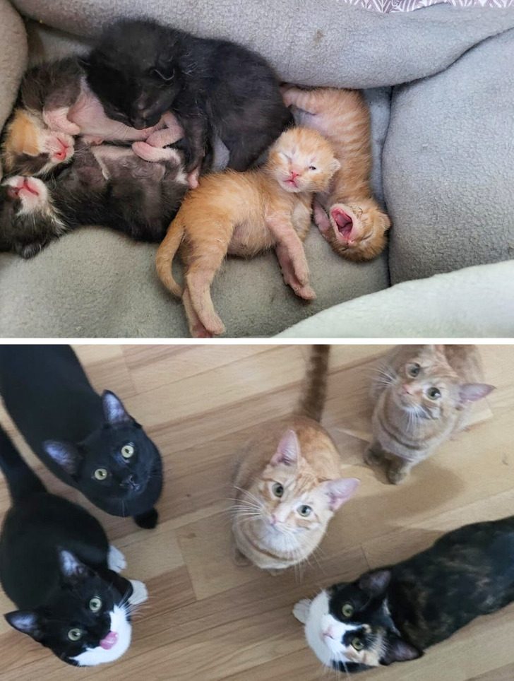 «Я нашла эту кучу котят в сарае и выкормила их из бутылочки. Им было дня 3 от роду, а сейчас около семи месяцев»