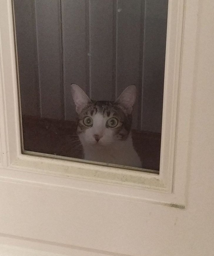 1. «Когда я ем, кот пытается украсть все со стола. Поэтому я оставляю его за пределами кухни и закрываю дверь, а он смотрит на меня вот так»