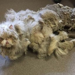 Знакомьтесь, это персидский кот по кличке Синдбад. Прежний хозяин питомца в силу своего преклонного возраста уже не мог заботиться о нем должным образом, поэтому шерсть кота так свалялась, что он едва ли мог передвигаться.