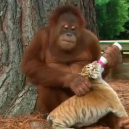 В Миртл Бич Сафари (штат Южная Каролина, США) самец орангутанга взял на себя заботу о четырёх тигрятах: кормит их из бутылочки, играется и проводит с ними свободное время.