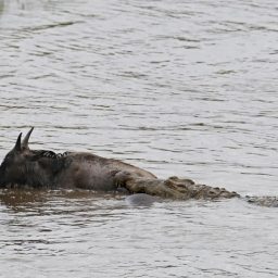 34-летнему израильскому фотографу Вадиму Онищенко удалось поймать невероятный момент, случившийся в дикой природе. Крокодил схватил антилопу гну и уже начал утаскивать её под воду, как вдруг появился бегемот и разрушил планы рептилии, тем самым он спас антилопу гну от смерти в пасти крокодила.