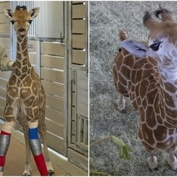 Трёхмесячная самка жирафа по кличке Мситуни родилась в зоопарке Сан-Диего с заболеванием суставов.